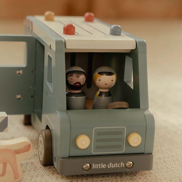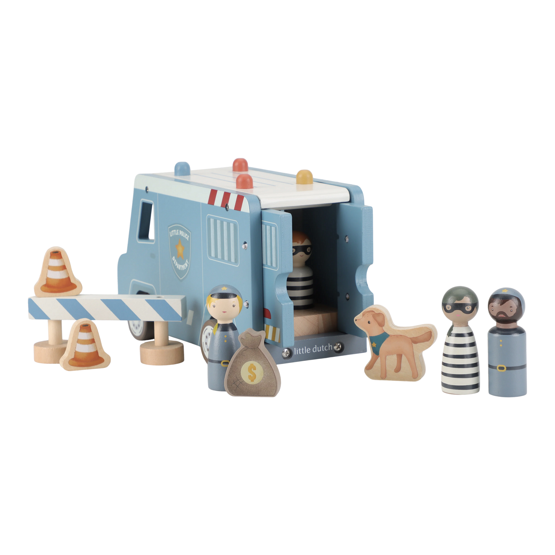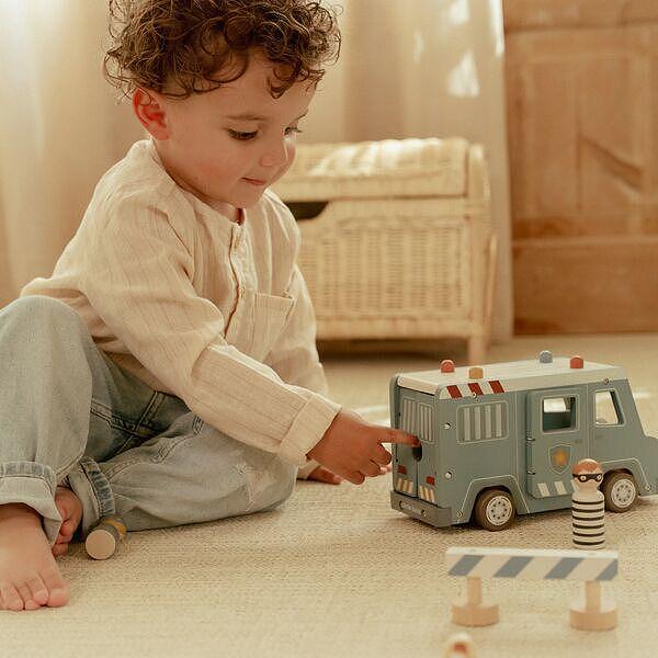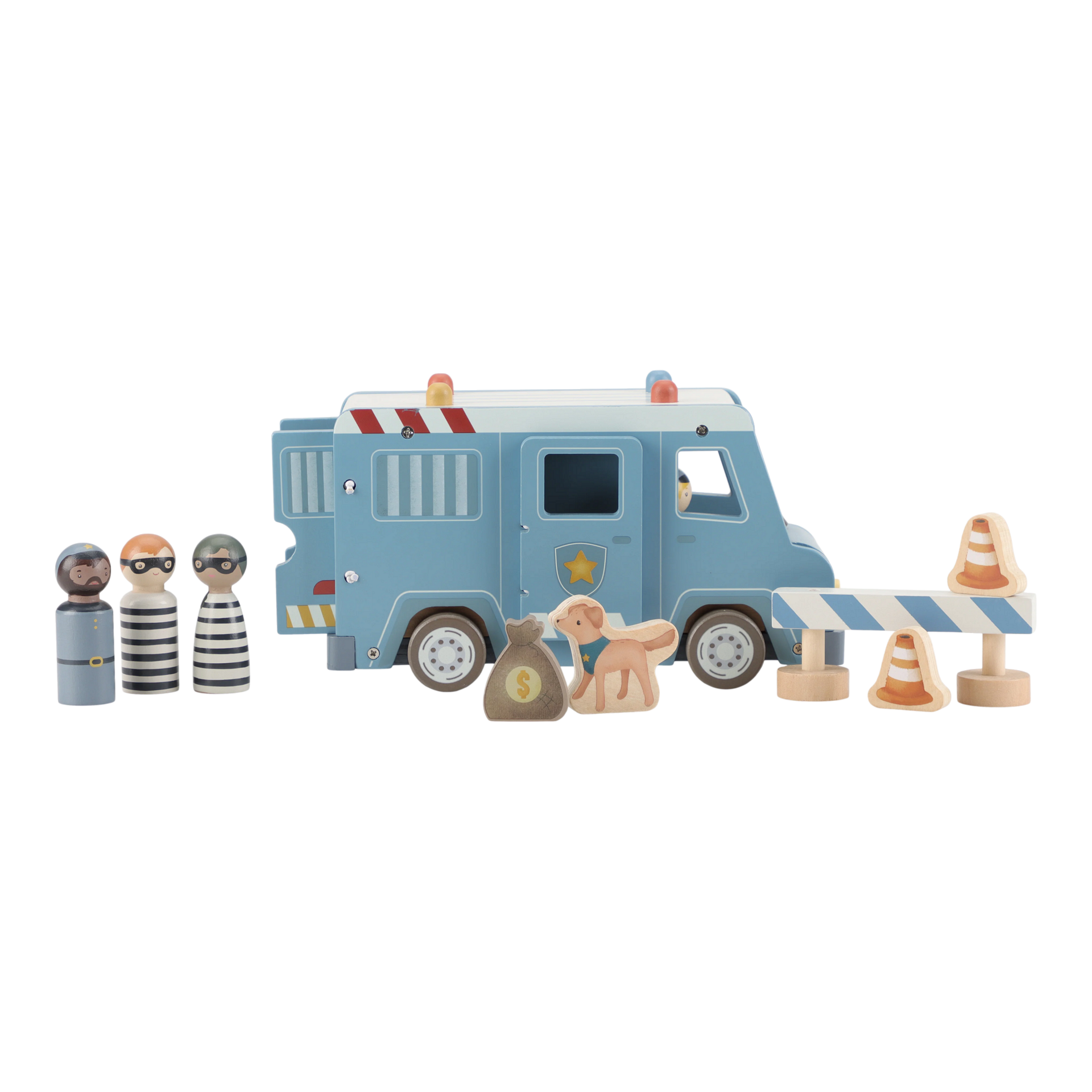 Престъпници зад решетките! Този дървен полицейски ван съдържа четири фигурки (двама полицаи и двама престъпници), полицейско куче, торба с пари, конуси и бариера. Ванът има клетка със сгъваема врата, така че престъпниците могат да бъдат транспортирани безопасно. Пресъздайте вълнуващи полицейски приключения и пазете града в безопасност!