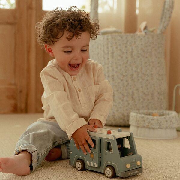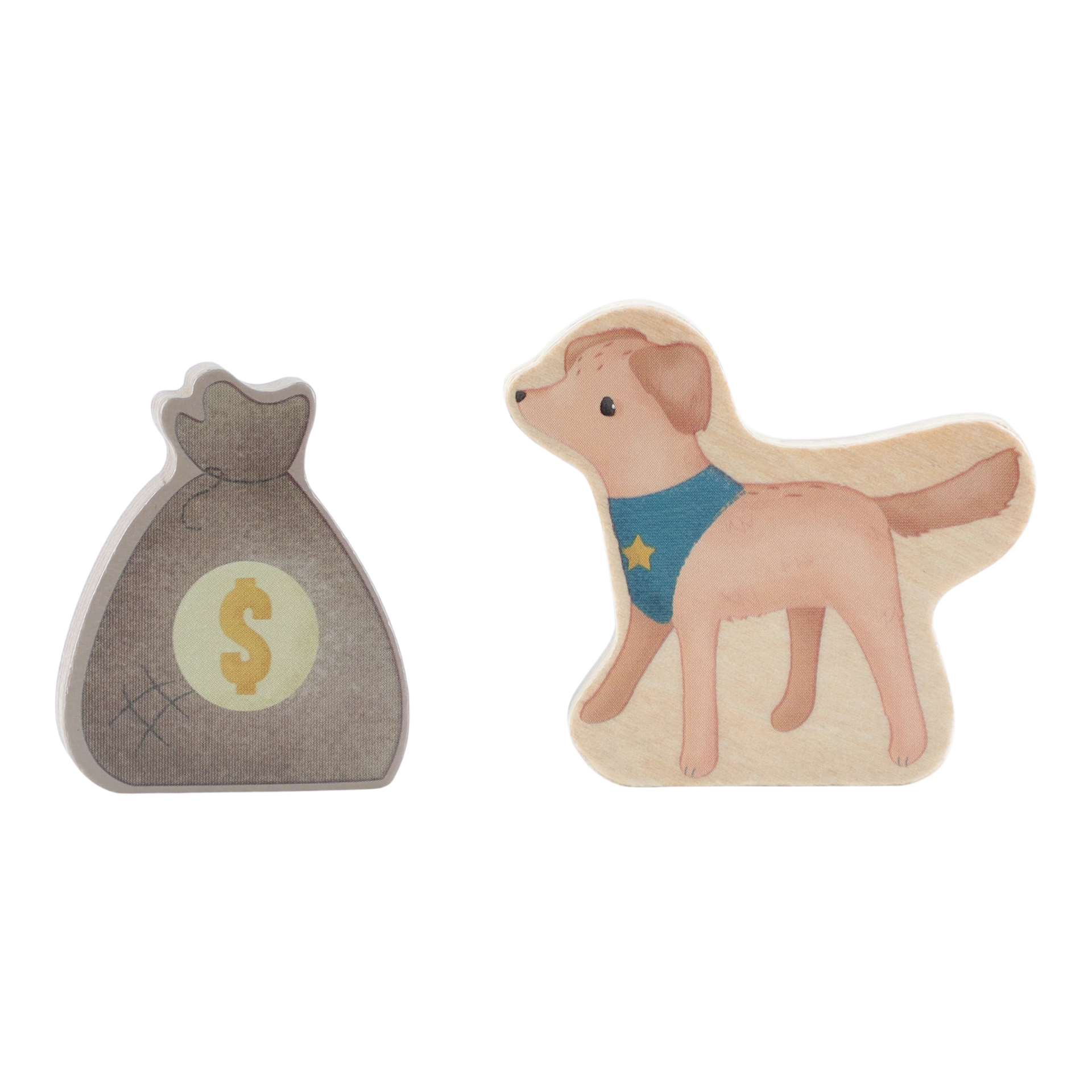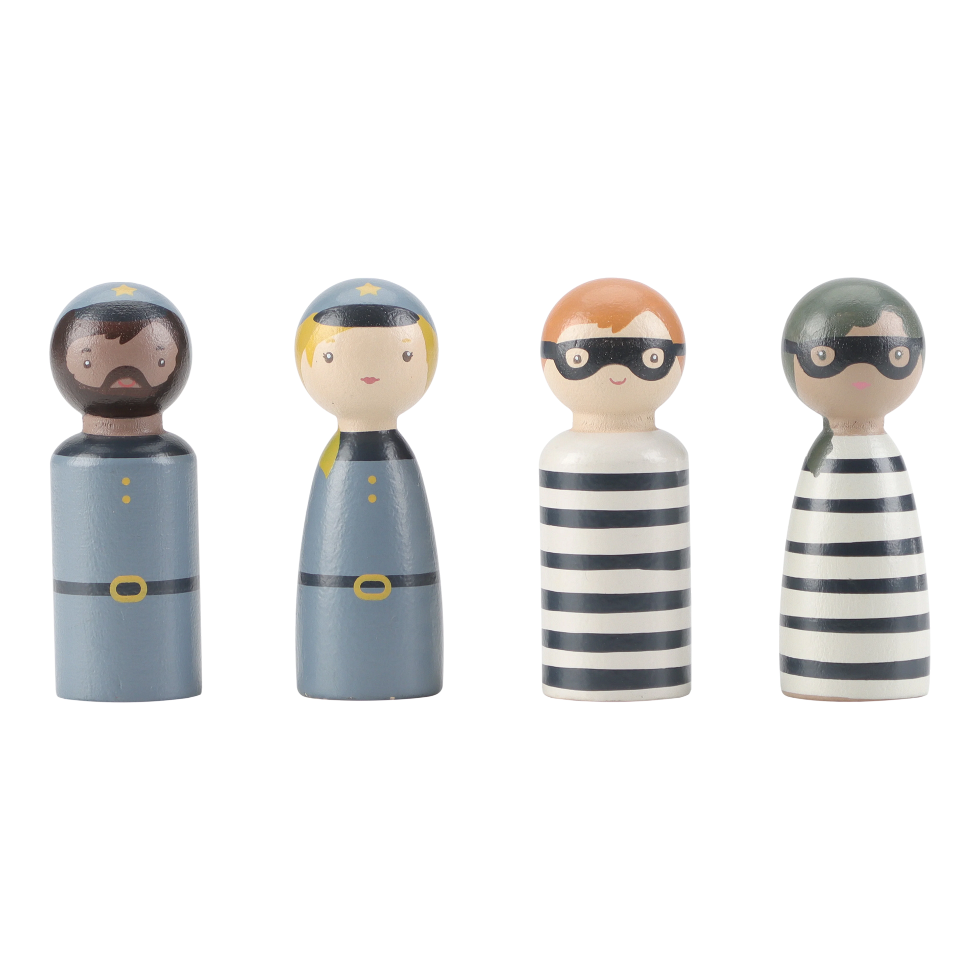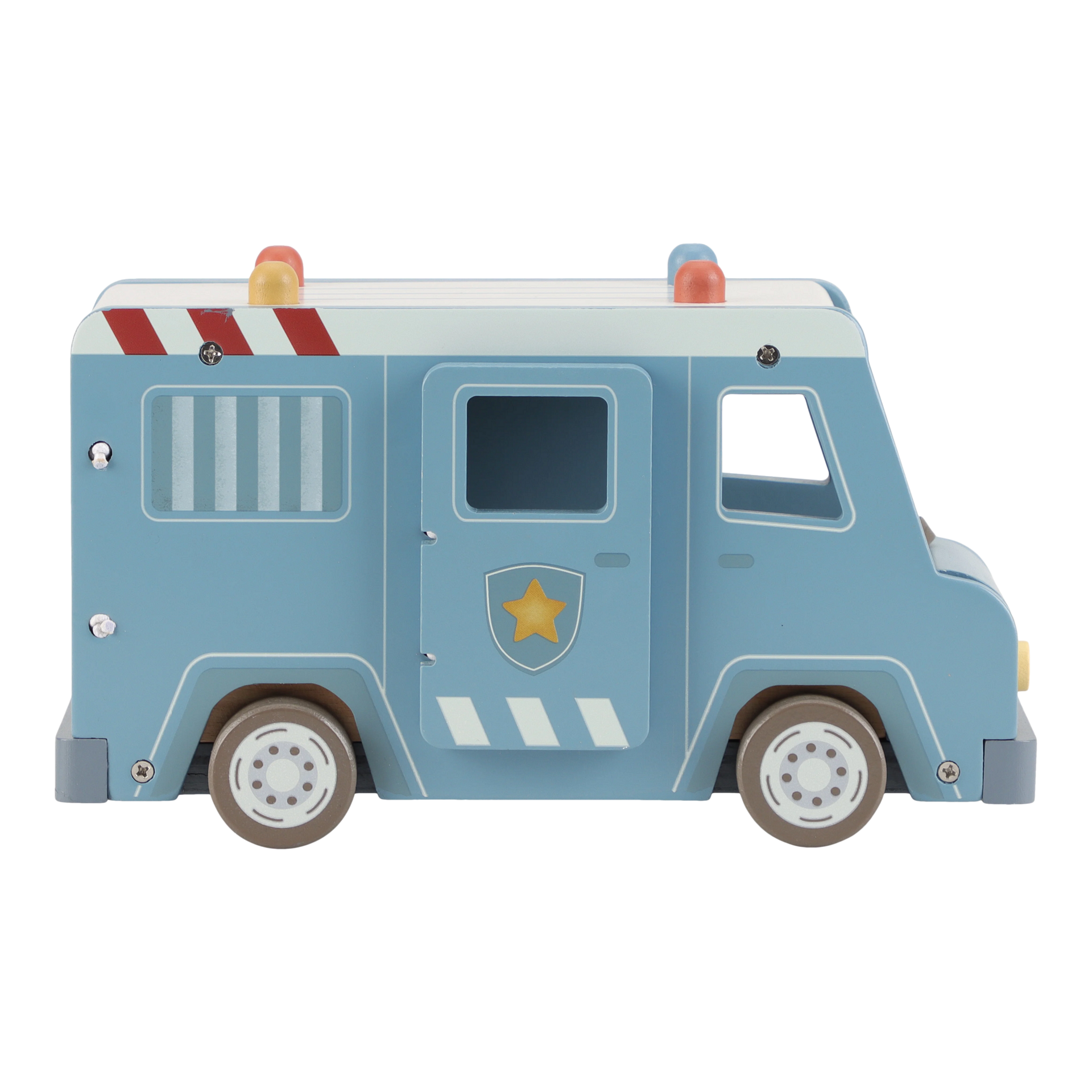 Престъпници зад решетките! Този дървен полицейски ван съдържа четири фигурки (двама полицаи и двама престъпници), полицейско куче, торба с пари, конуси и бариера. Ванът има клетка със сгъваема врата, така че престъпниците могат да бъдат транспортирани безопасно. Пресъздайте вълнуващи полицейски приключения и пазете града в безопасност!