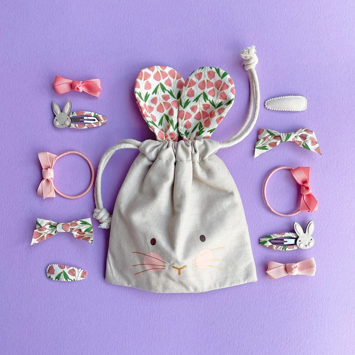Търсите смислен великденски подарък без захар? Тази очарователна торбичка във формата на зайче с уши с флорален принт, пълна с десет красиви аксесоара за коса, е възхитителен пролетен подарък, който със сигурност ще ви донесе усмивка!